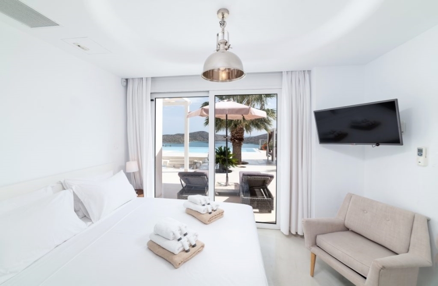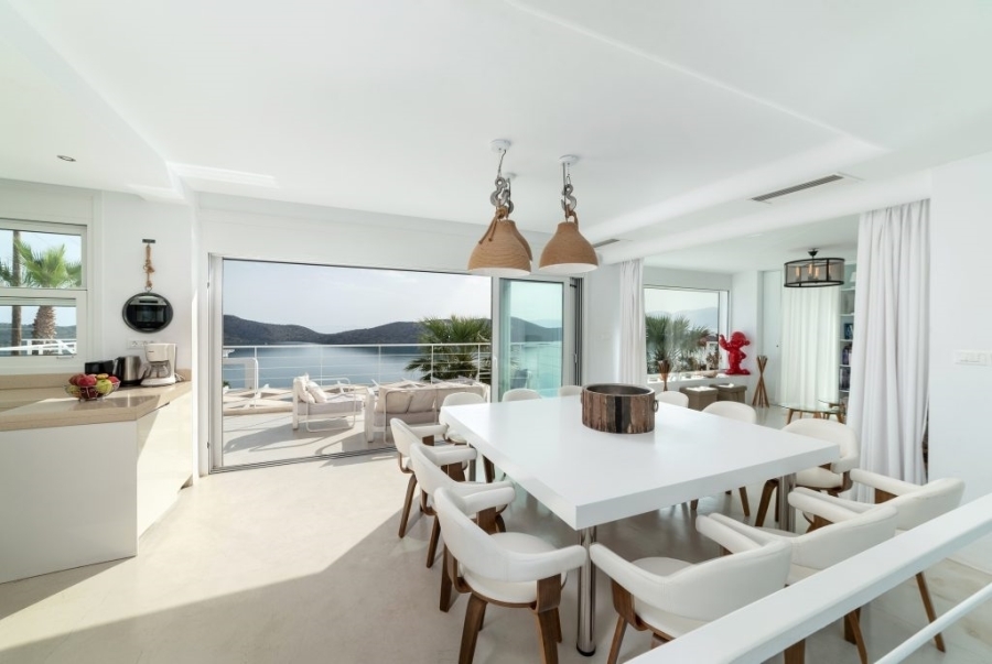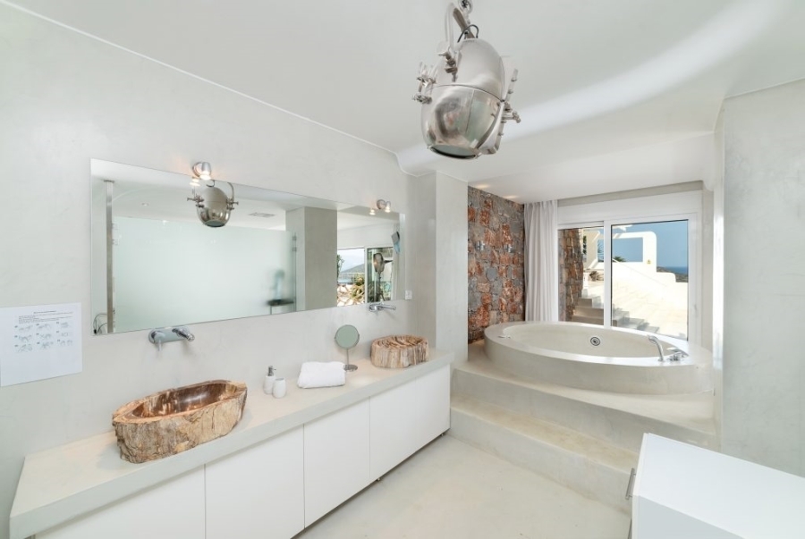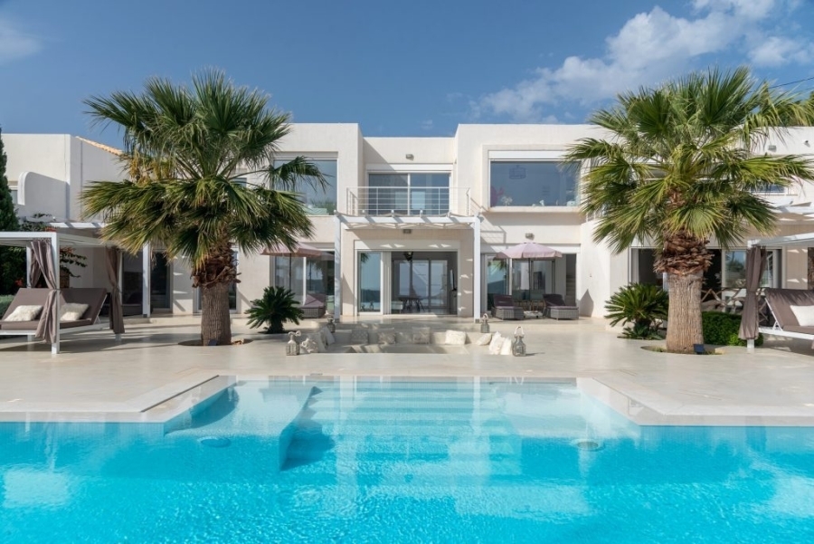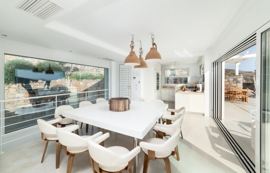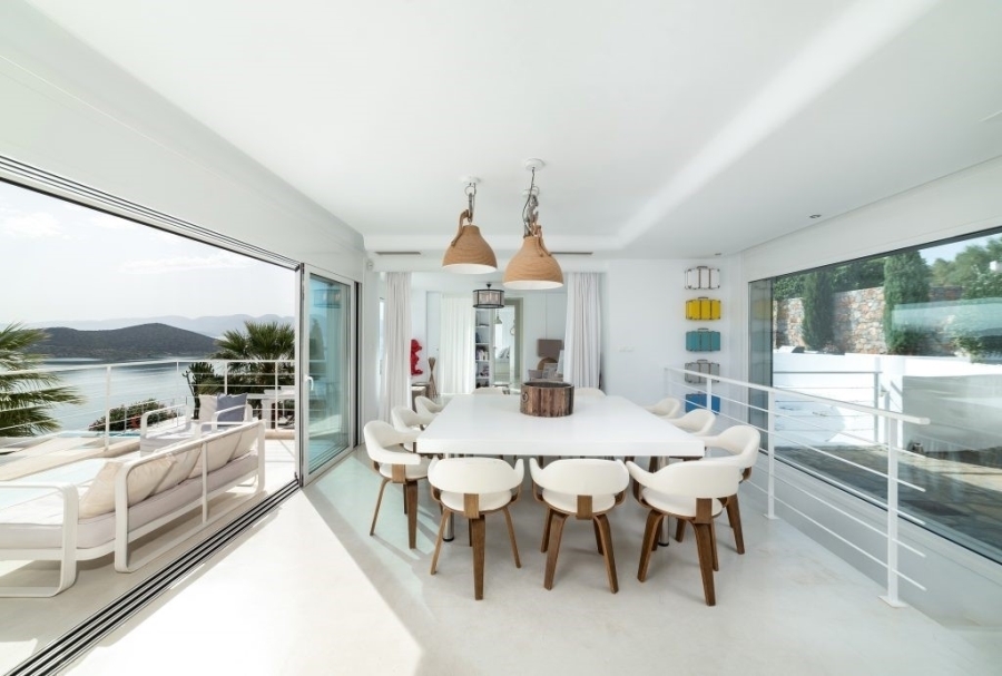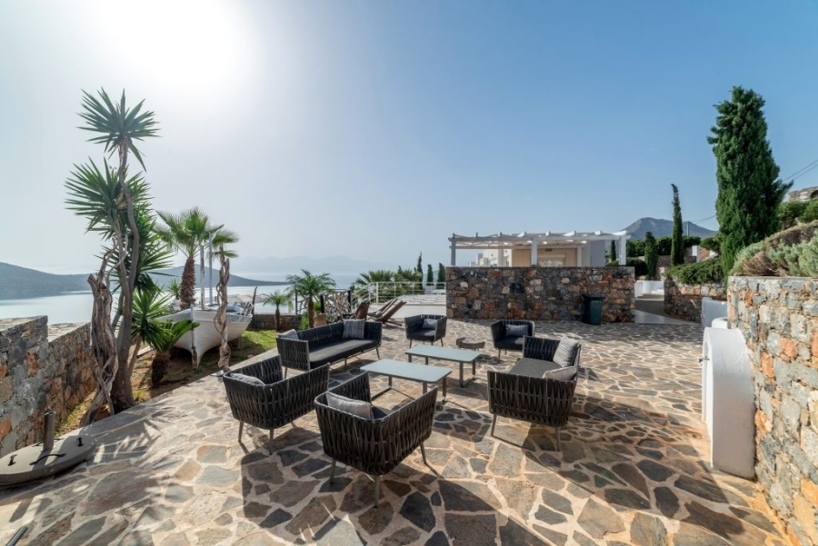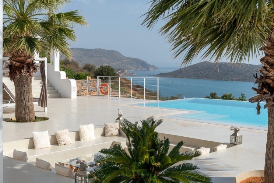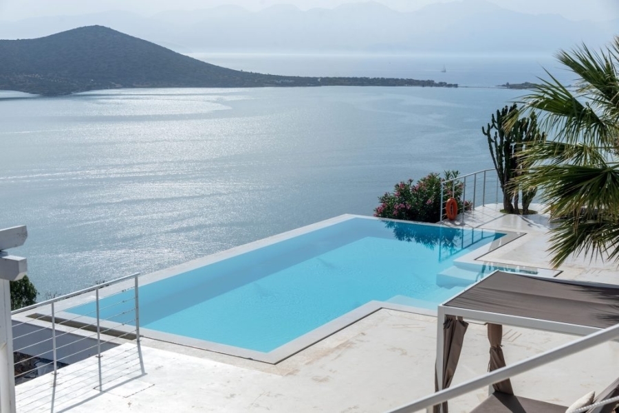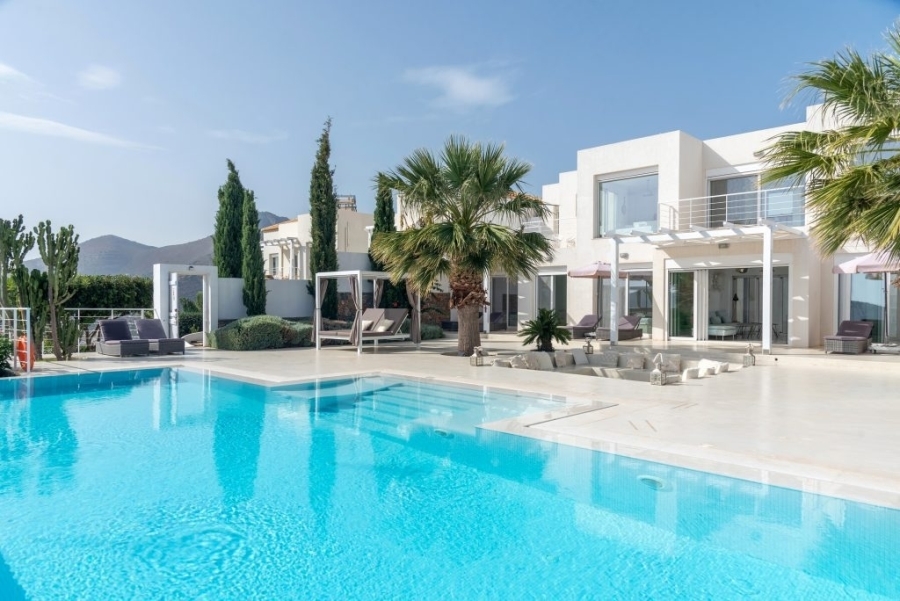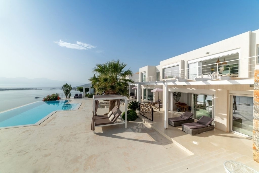Luxury villa of 260m2 on a plot of 2.229m2 with six bedrooms is available for sale just 400 meters from the sea, 1.5km from cosmopolitan Elounda and 10km from the picturesque town of Agios Nikolaos, Eastern Crete. The ground floor opens into a sitting room perfect for relaxing. It consists of three double bedrooms with en-suite bathrooms and the main bedroom of 50m2 which has a double shower with private bathroom, toilet and a delightful jacuzzi. All living areas throughout the villa offer stunning views of the pool area. The first floor of the villa includes an open area with kitchen, dining room and living room, as well as balconies that offers a spectacular view of the Elounda Bay. There are also two WCs and two bedrooms with private bathrooms. At the back side of this exceptional villa is a magnificent amphitheater. Around of the villa there are shady pergolas and lounges ideal for relaxation. A shaded dining area, barbecue area and a sunken seating area next to the 69m2 pool form a dreamy space. The villa is air-conditioned, with central heating, aluminum frames, storage spaces, parking space and uniquely landscaped gardens. The luxury, comfort and uniquely modern design of the villa make it an important part of an unimaginably quality life.