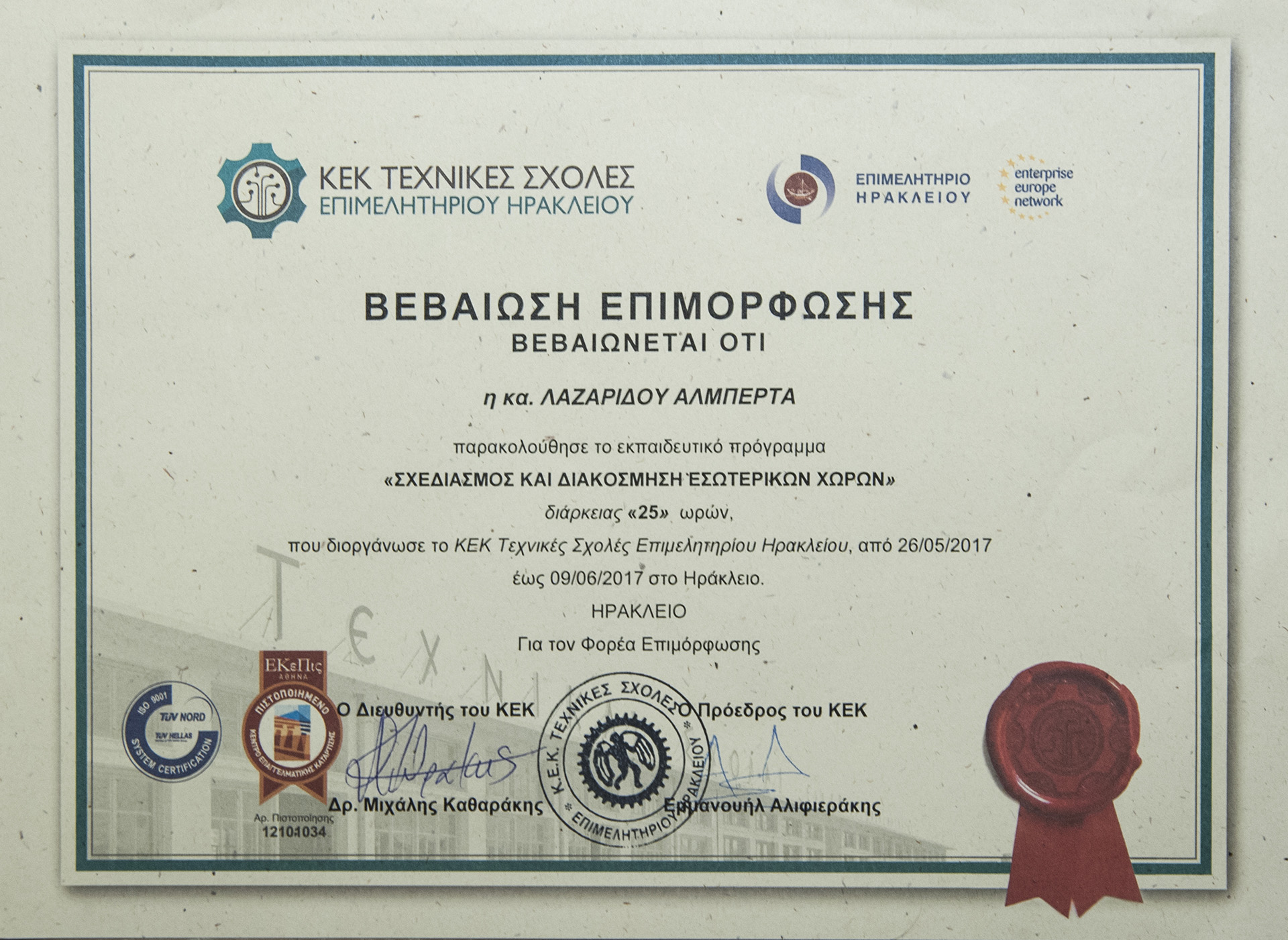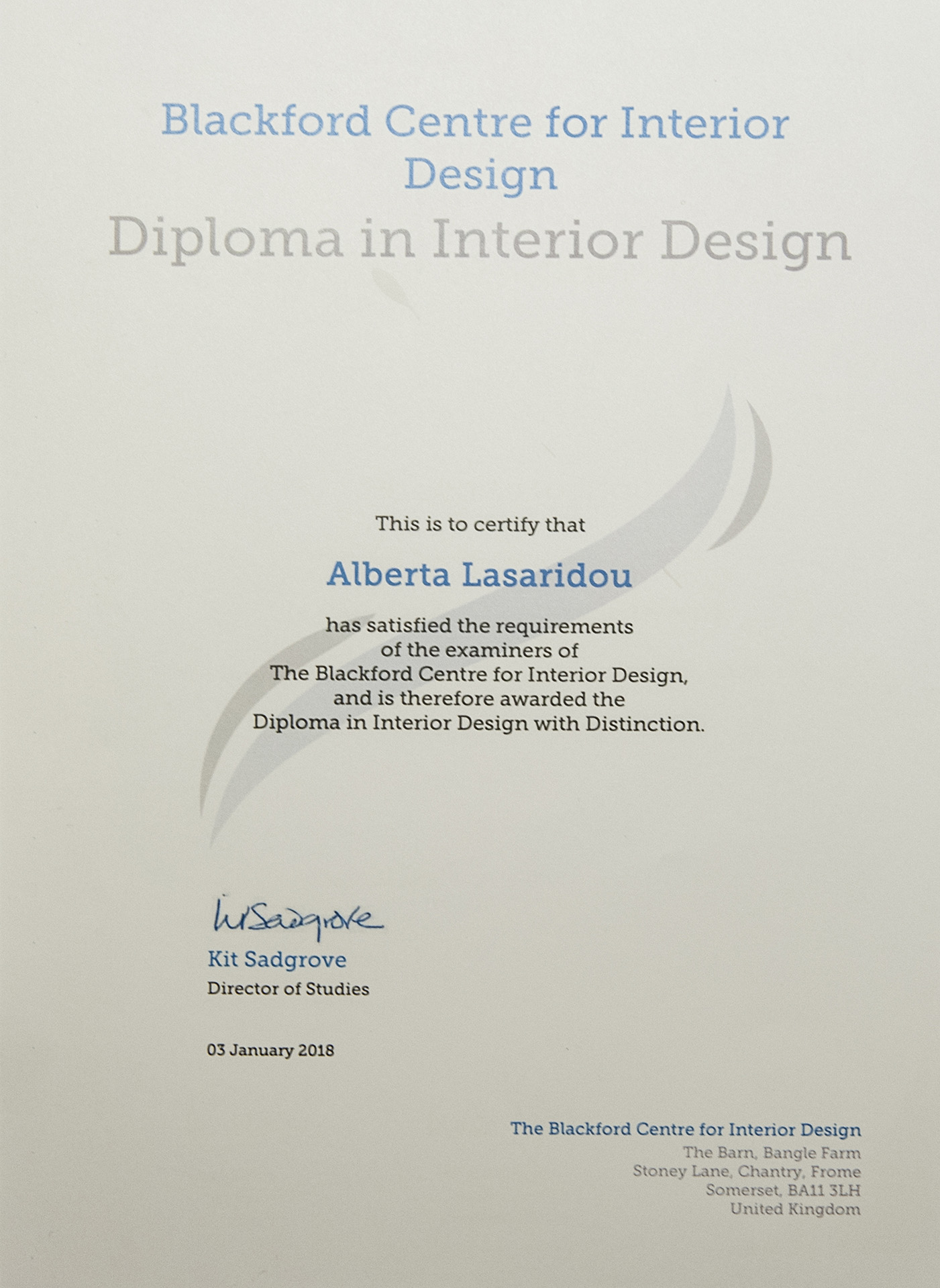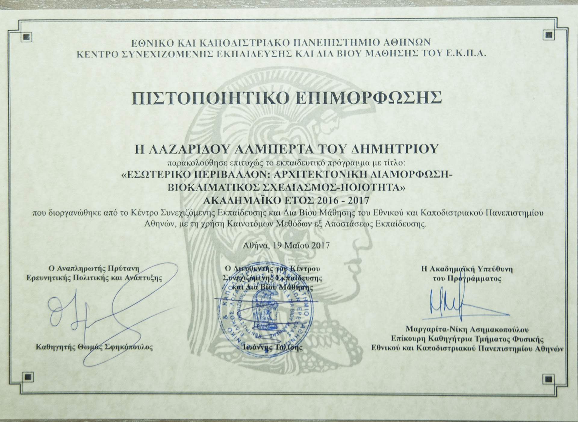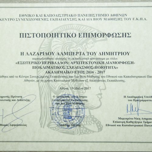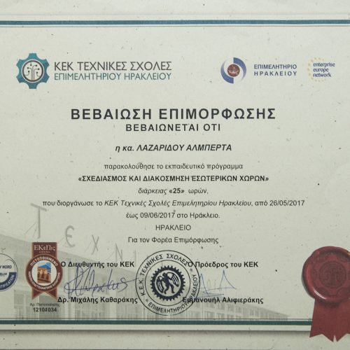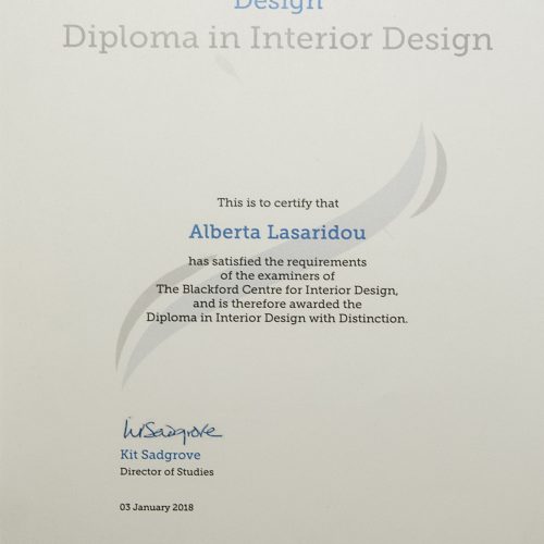 She then studied Architectural Interior Design and Bio-climatic Design at the Kapodistrian University of Athens and Interior Design at the Blackford Center for Interior Design. She now concentrates her professional knowledge with her long experience in this subject.